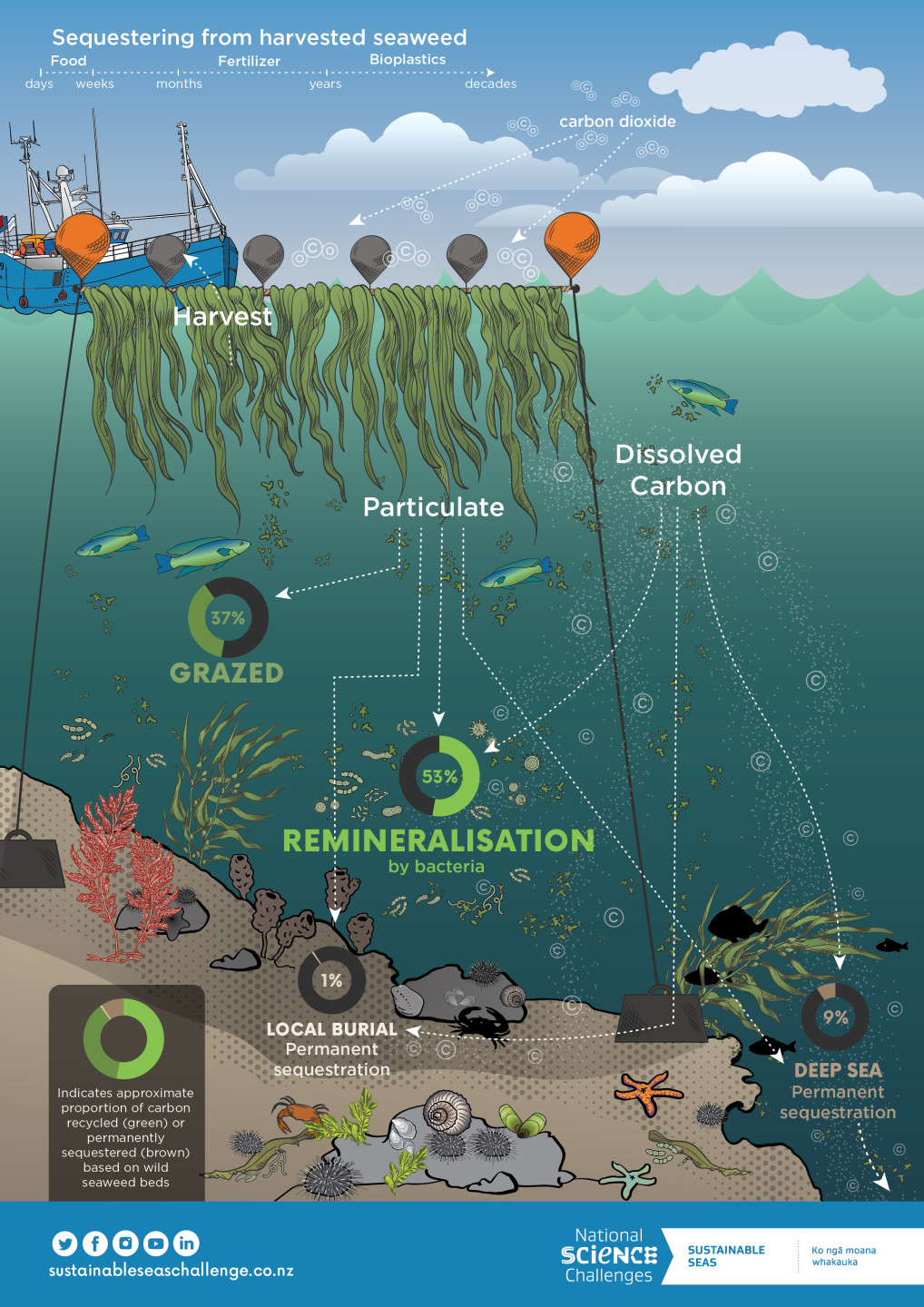 This infographic shows the pathways of carbon flow from seaweed aquaculture based on measurements and calculations of carbon sequestration pathways in wild seaweed beds (Krause-Jensen & Duarte 2016). The amount of carbon removed from the ocean in harvested seaweed is not quantified. (November 2021)