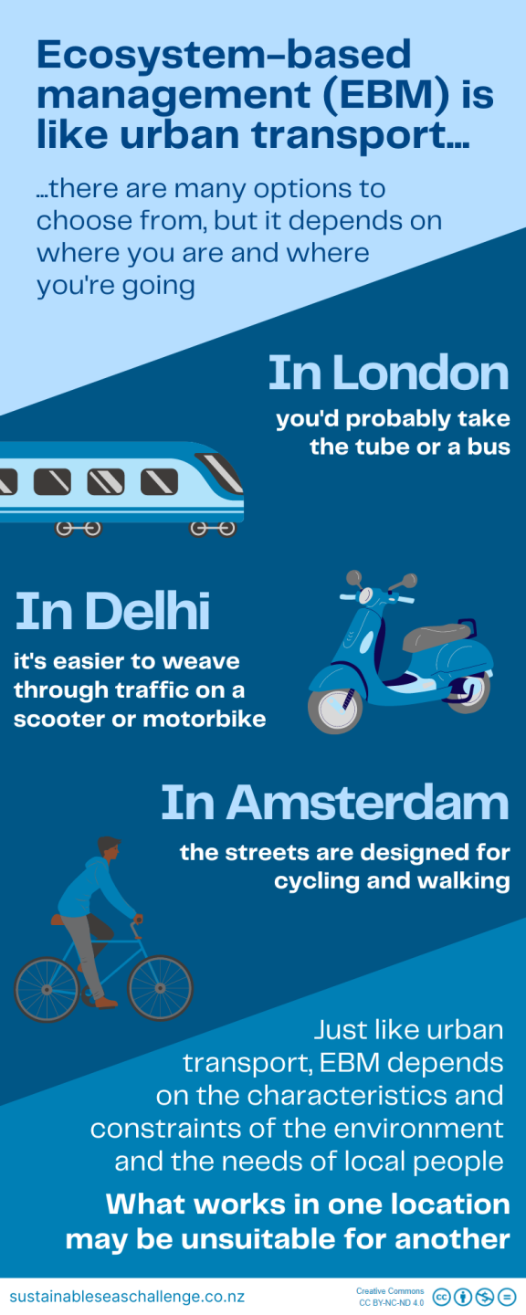 This infographic uses the analogy of urban transport requirements to explain ecosystem-based management (EBM).